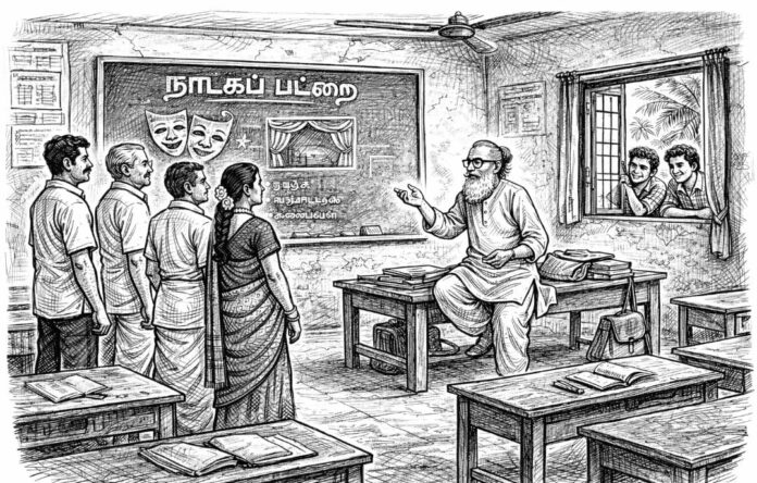 “டேலேய், சங்கதி வந்துச்சா, மந்தையம்மன் கோயில் திர்ழாக்கு நம்ம நாடகம் போடுறதா ஆகிப்போச்சுடா, நான் வர்றப்ப கையத்தட்டி சீட்டியடிச்சு என்னைய எப்படியாச்சும் ஏத்திவிட்ருங்கடா” என்றான். கொஞ்சம் பாவமாக இருந்தது. “விடு பங்கு, கெளப்பிருவோம்” என்று அவனை உற்சாகப்படுத்தி அனுப்பி வைத்தோம்.