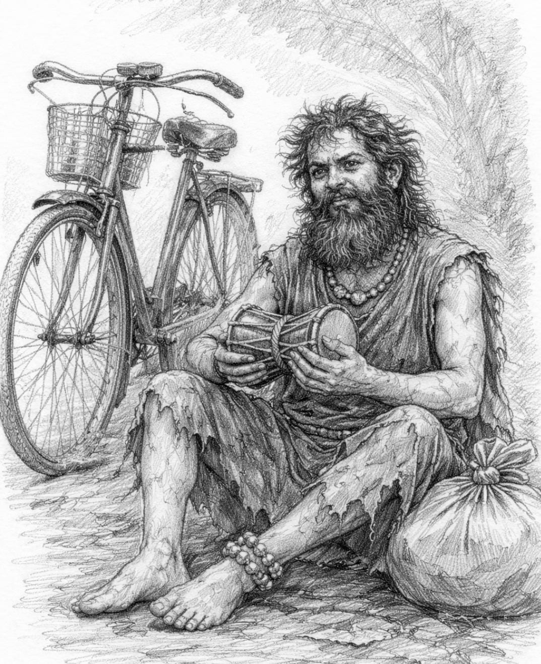 மாடியை நோக்கிக் கையைக்காட்டினாள் அம்மா. அம்மா முகமே சரியில்லை. ஏனோ மாடிக்குப் போகாமல் வெளியே வந்தேன். தெருமுக்கில் தெரிந்த உருவங்களைப் பார்க்க வியப்பாக இருந்தது. அந்தத் தாடிக்காரரிடம் ஏதோ பேசிக்கொண்டிருந்தார் காய்கறிக்காரர். அவருடைய சைக்கிள் ஓரமாக இருக்க, அதன்மீது தன் உடுக்கையை வைத்துக் கும்பிட்டார் தாடிக்காரர். பதிலுக்குக் காய்கறிக்காரரும் கும்பிட்டு அங்கிருந்து வண்டியை நகர்த்தினார். நான் திரும்பி விறுவிறுவென நடந்து வீட்டிற்குள் போய்விட்டேன்.